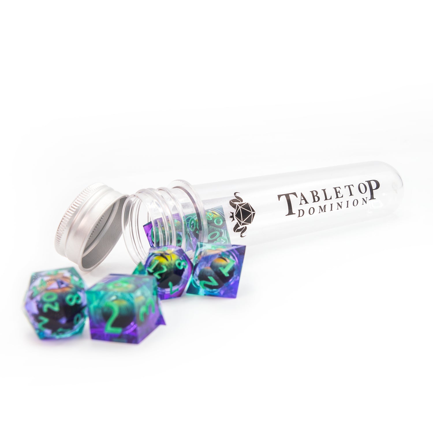 Acrylic and soft-edge dice sets arrive in clear, PETG recyclable test tubes that shoppers can pop straight into a dice tray or rucksack—an easy win for impulse sales. Sharp-edge resin, gemstone and metal ranges come in bespoke Tabletop Dominion solid-board boxes with a striking gloss spot-UV TTRPG-map finish and secure magnetic catch, adding real gift appeal. Our giant “Chonk” d20s ship in the same style of box, but the carton flips inside-out to create a ready-made shelf display, so they stand out the moment they land in store.