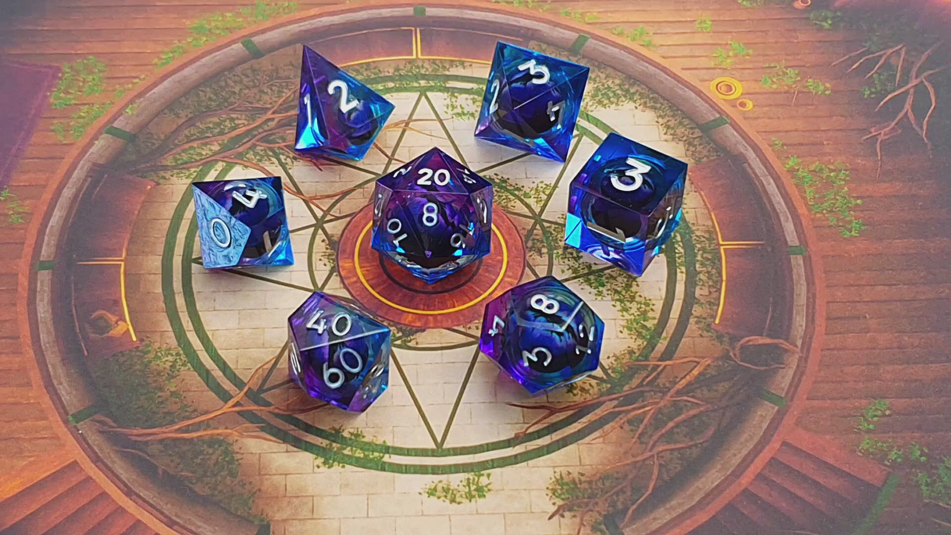 Delve into the mystical realms of Dungeons and Dragons with our Moving Eye range. This set of seven sharp-edged dice contains a mysterious secret: each die houses a liquid core where an eye forever watches, moving freely yet invariably settling with its unnerving gaze pointing upwards. Ideal for the shadowy dungeons of your next adventure, these dice add an element of the eerie to each roll.