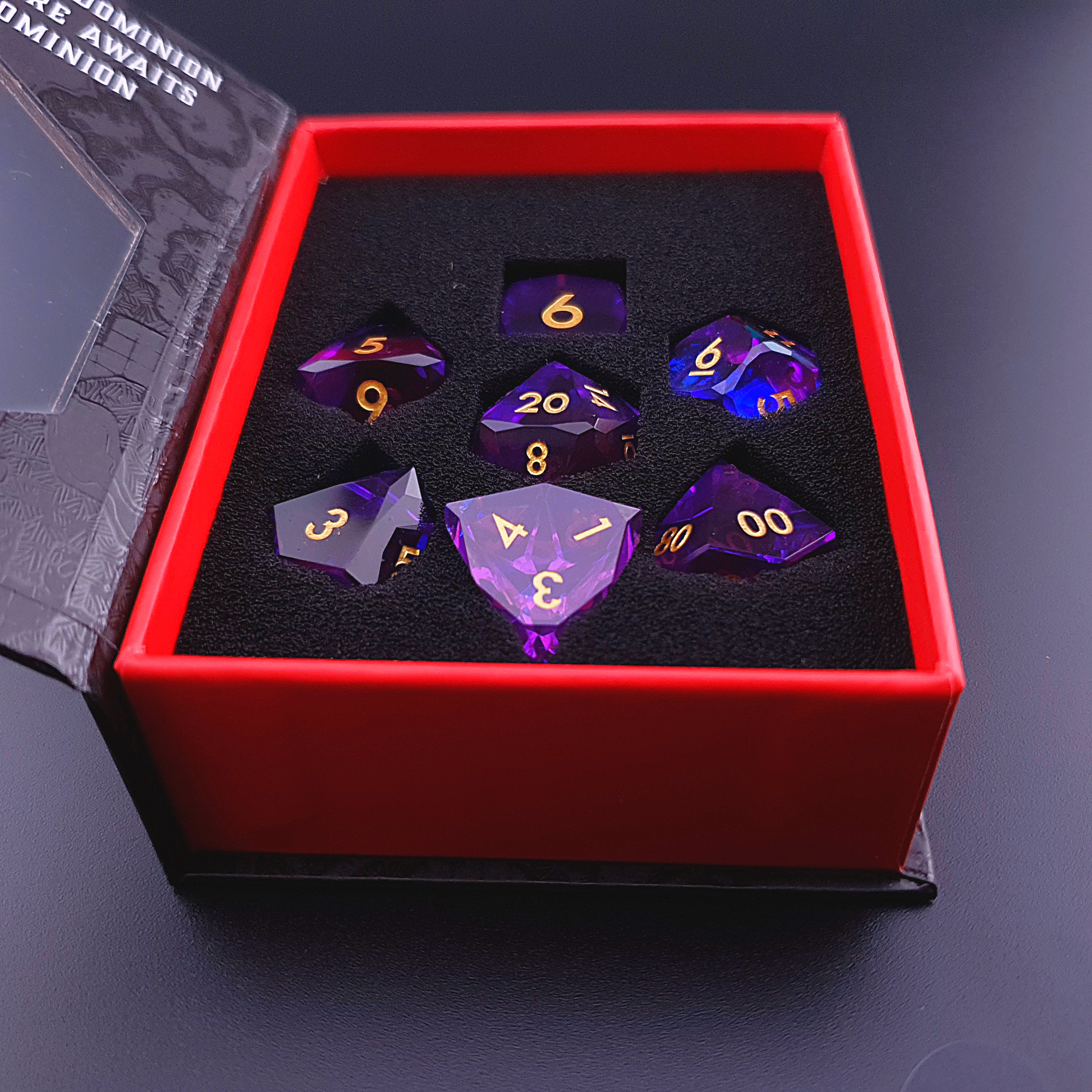 Each die is shaped with a diamond cut finish, reflecting light with striking clarity. The faceted edges catch every flicker of candlelight or LED glow, creating a mesmerising effect as you roll for glory.