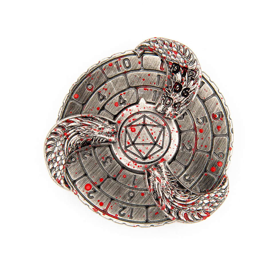 The core of the Prophecy Wheel is securely housed within a stunning zinc alloy case, adorned with an intricate dragon design and a prominent D20 motif at the centre. This robust metal casing not only protects the core and the bearing mechanism that allows it to spin freely, but also adds a touch of elegance and fantasy to your gaming setup.