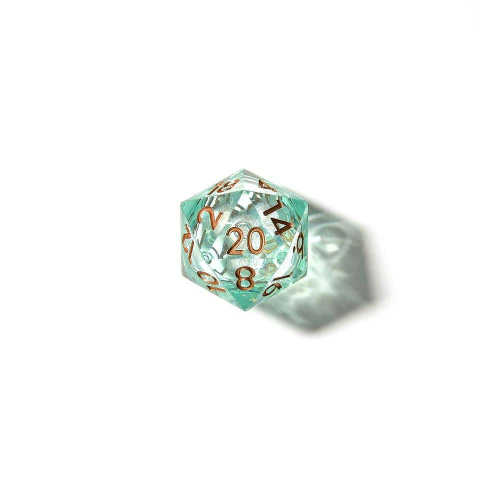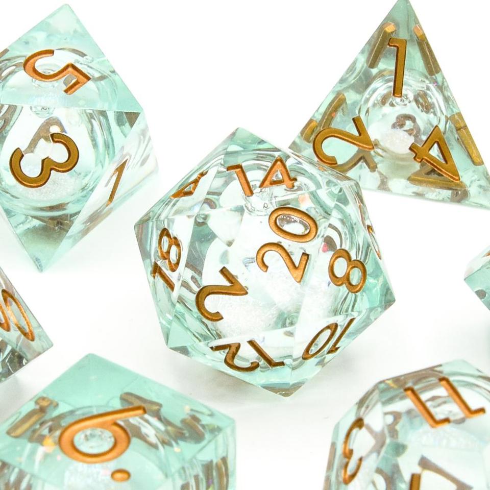 The Liquid Core dice set stands out with its sharp-edged design, ensuring fairness in rolling, paired with the captivating movement of mica within the liquid core. This combination not only looks spectacular but also adds an element of magical realism to your gameplay.
