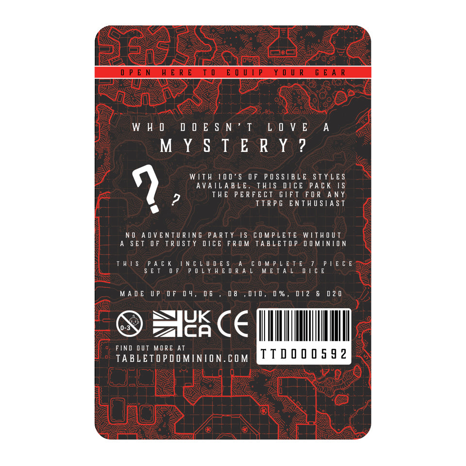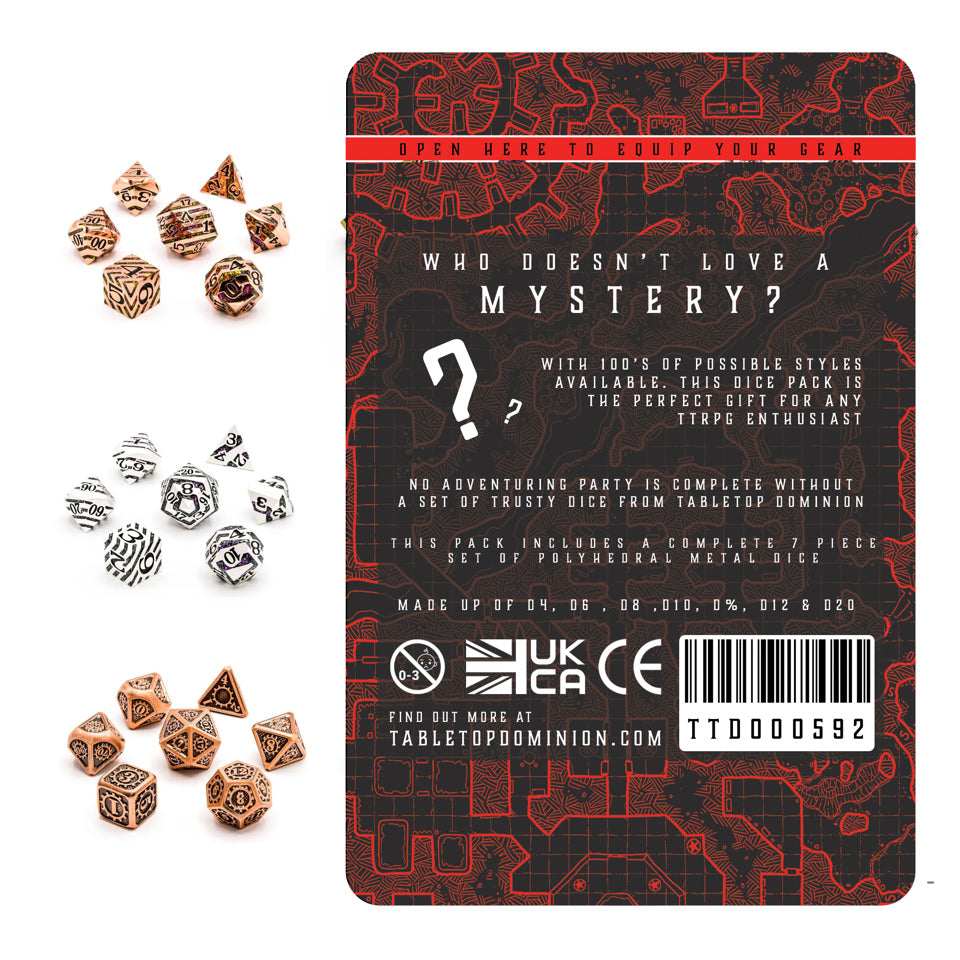 The adventure begins the moment you receive your Metal Mystery Dice set, each pack sealed within an attractive foil bag that keeps the specific style and colour a thrilling mystery. The anticipation of discovering which unique set you receive adds an exciting dimension to your gaming preparations.