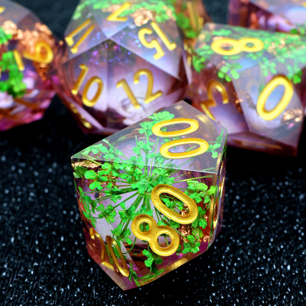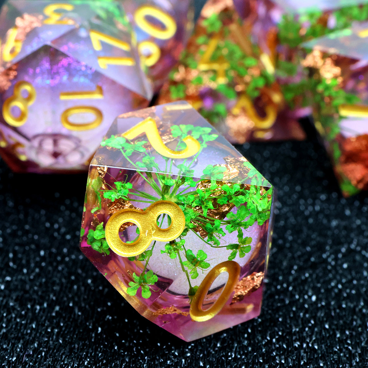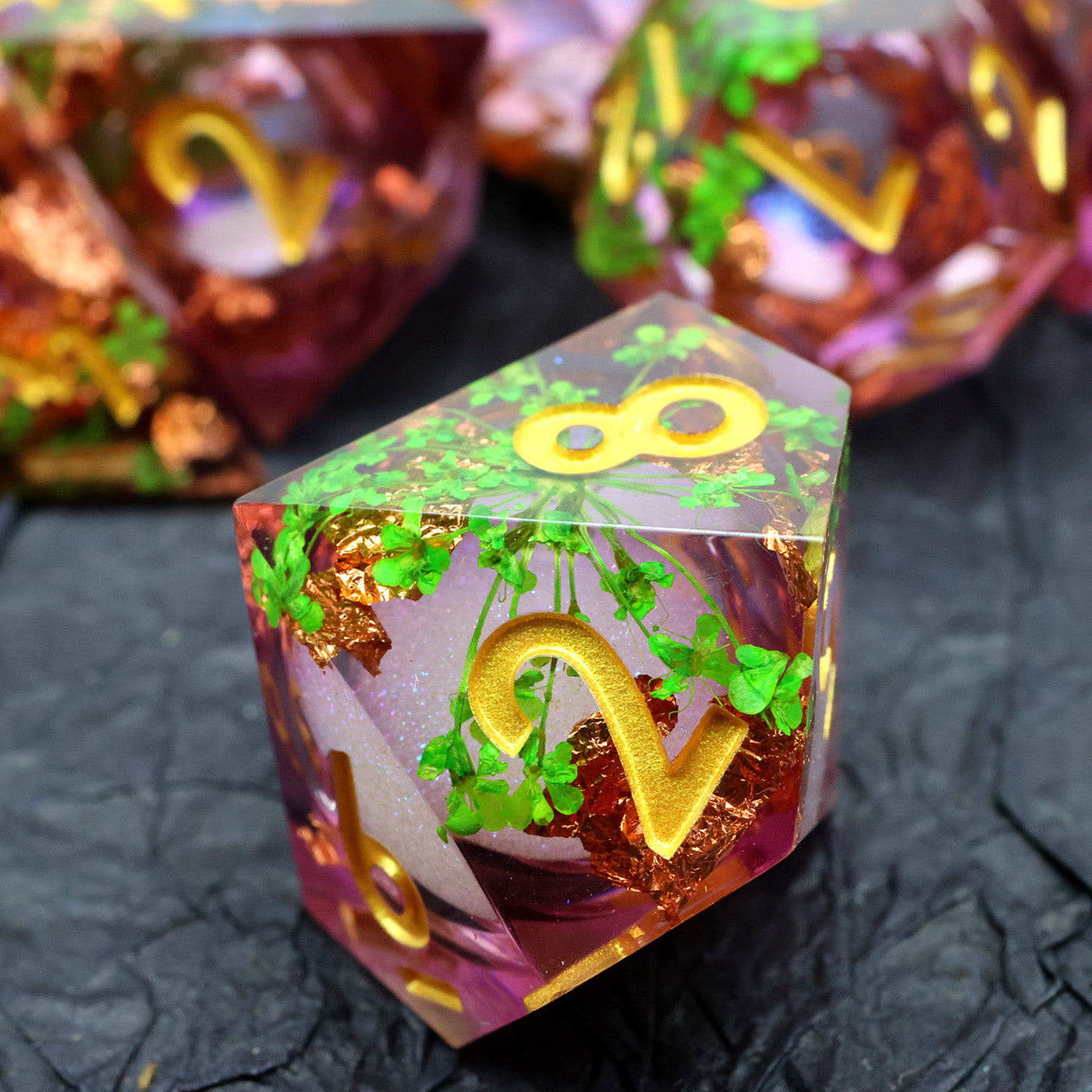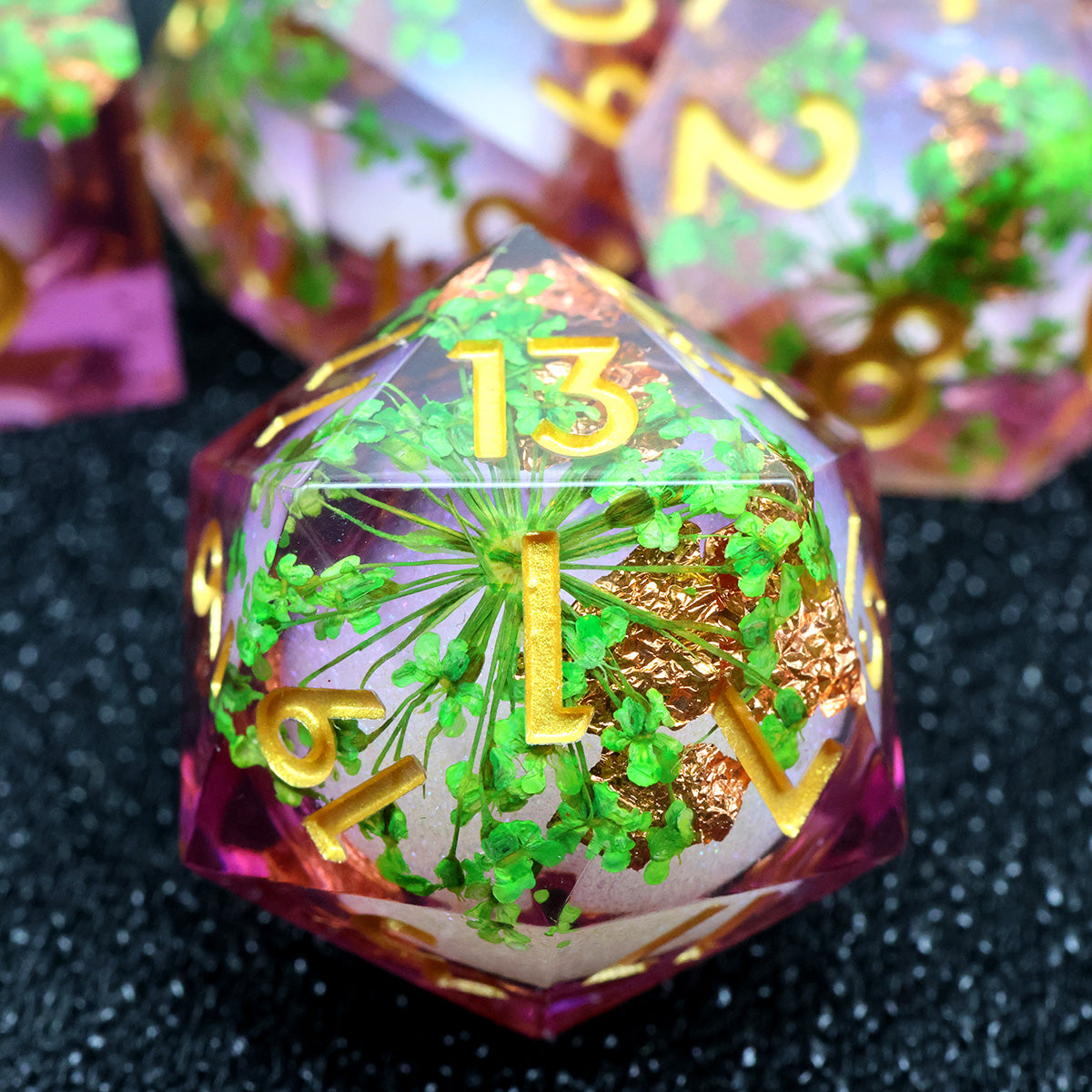 The Liquid Core dice set stands out with its sharp-edged design, ensuring fairness in rolling, paired with the captivating movement of mica within the liquid core. This combination not only looks spectacular but also adds an element of magical realism to your gameplay.