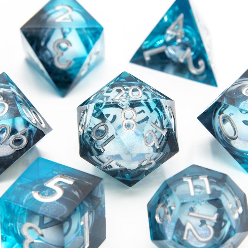 Dive into your Dungeons and Dragons campaigns with the Liquid Core Sharp Edged 7 Piece Set, a collection of dice that offers both precision and magical aesthetics. Each die is crafted with sharp edges for accurate rolling and contains a liquid core filled with sparkling mica, creating a stunning visual effect that enhances the gaming experience. Available in a variety of styles and colours, these dice are designed to complement any DnD adventurer's toolkit, adding a touch of enchantment to each roll.